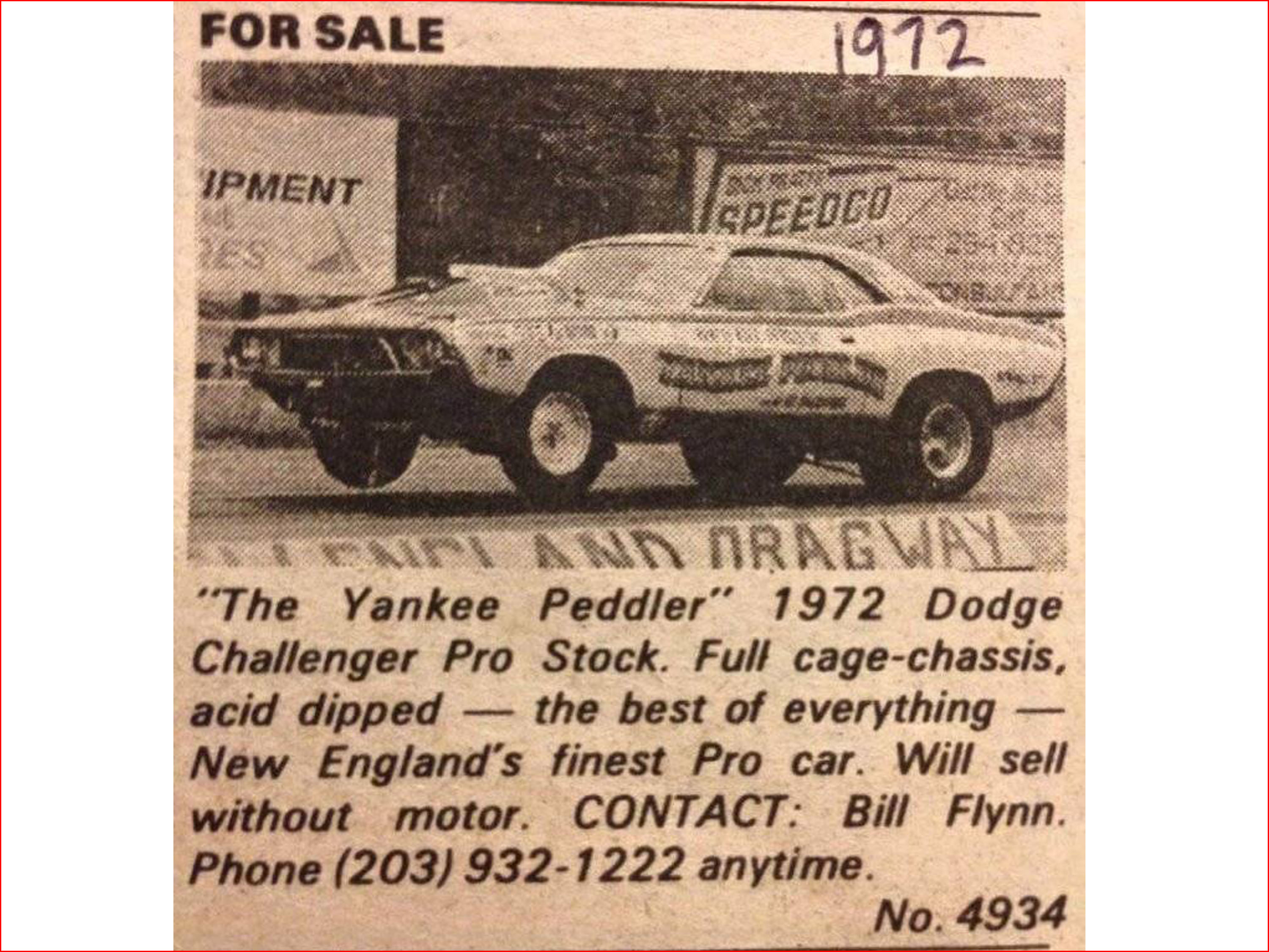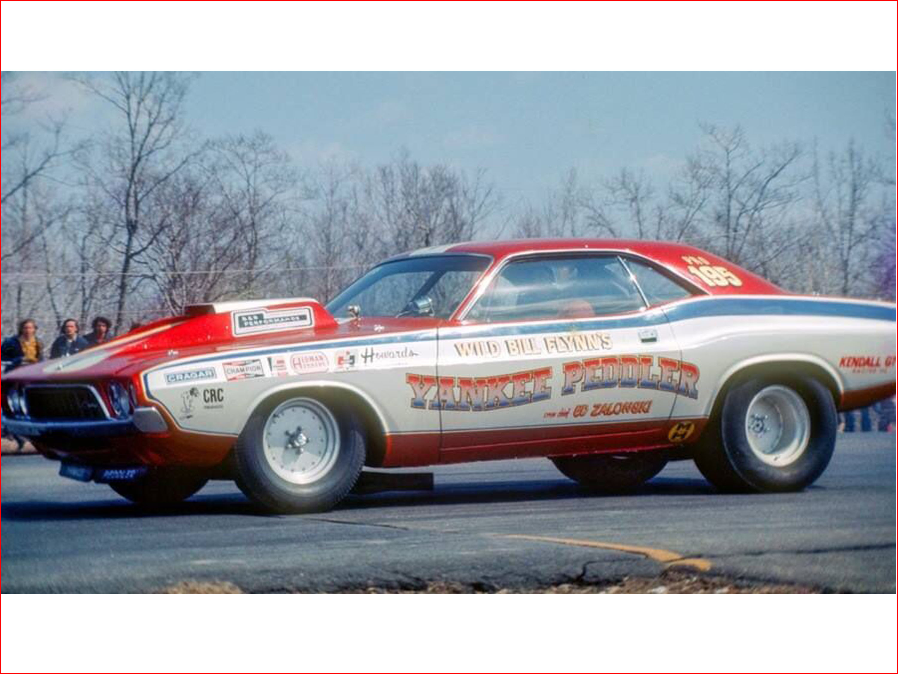 Now a 1971 Challenger with a new driver, the RAMCHARGERS had high hopes that this season would be much more prosperous. They had stumbled in the past with a lack-luster season, and always bounced back with dominance. They hoped this would be the case in 71. But not so much. Leroy Goldstein was doing quite well with the Challenger Funny Car. But Leroy Palarchio was not seeing the same fortune with the Pro Stock version. No matter what the team did, the car simply struggled all year. The chassis never came around and they fought traction and stability problems all season. Making 1971 a mere repeat of the season prior. Thank God that the Funny Car was not having the same issues, and kept the teams name held in high standard. This car, however, just wasn't right. No matter how good the driver, the car did not comply. So, at the end of the 1971 season, the RAMCHARGERS had had enough of Pro Stock. Palarchio returned to the machine shop, building Hemis, and the car was sold to Bill Flynn shortly after the season ended. Flynn converted it to 1972 cosmetics, the same way it had been altered the year before. He then campaigned it for the next two seasons as the "Yankee Peddler", making it join a long list of famous racecars under the same name.