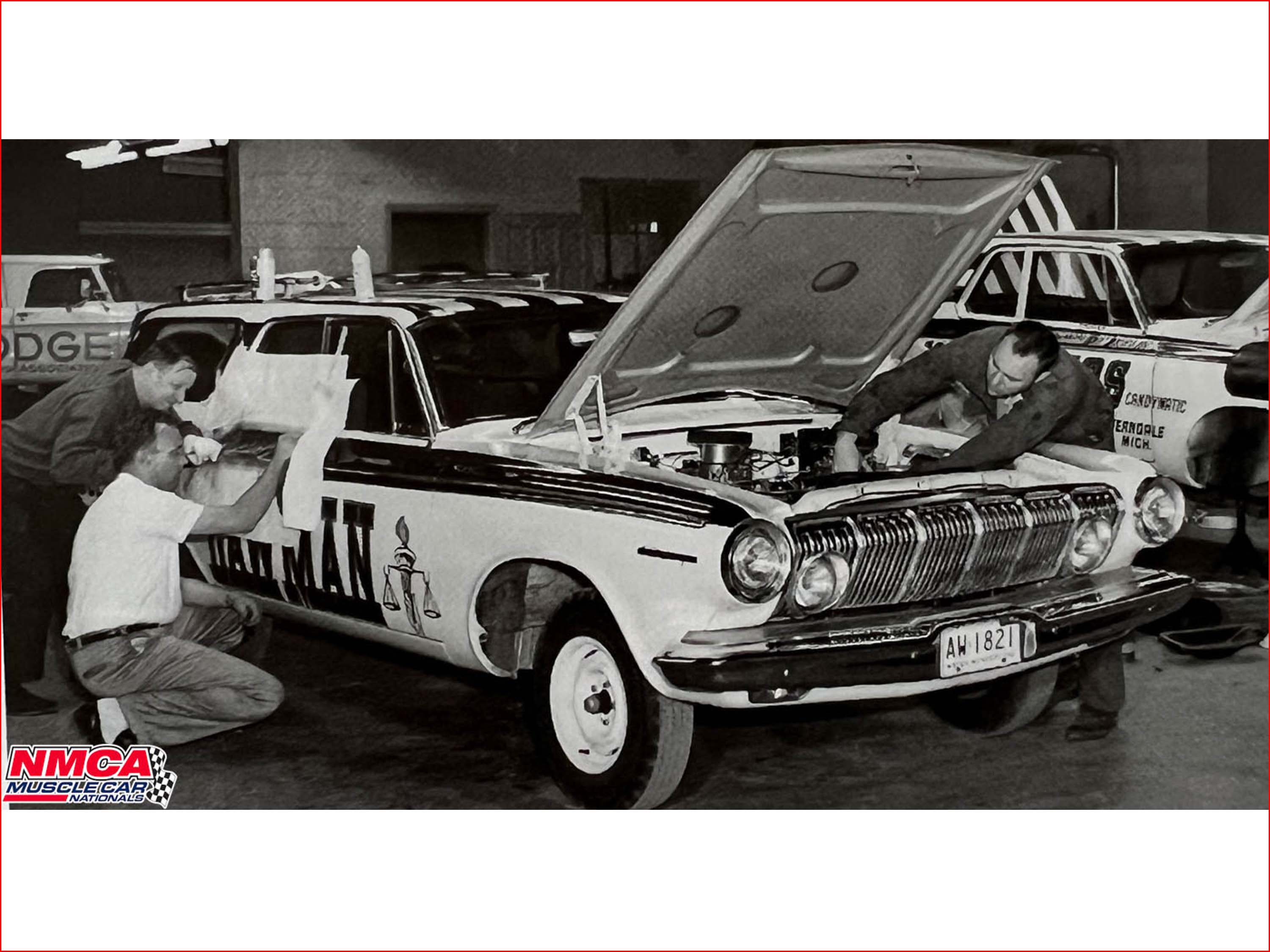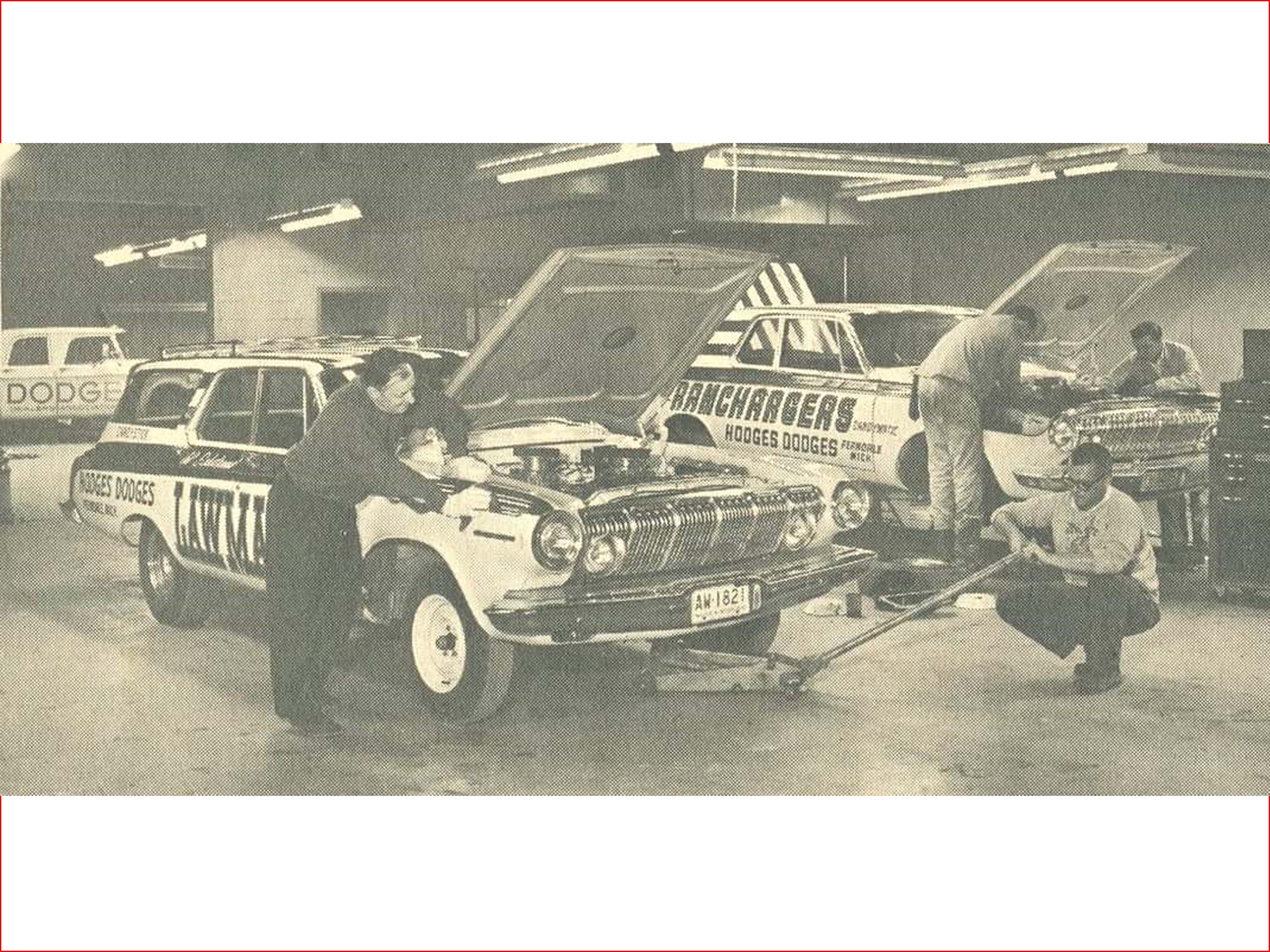 With the successes piling up for the RAMCHARGERS, and Dan Mancini's idea of running 2 cars, one automatic and one manual, plans were created for the team's new addition. As per Mancini's thoughts of one car being called Candymatic and the manual car being called Candystick, the boys began to discuss pros and cons. With the difficulty of traction with the manual transmissions, it was concluded to try a Station Wagon for the Candystick car. Wagons having much more weight at the rear of the car, in theory, would be better suited for that combination. So the order was put in, and Frank Wiley at Dodge was more than happy to oblige. A brand new 1963 Dodge 330 Wagon was constructed for the RAMCHARGERS in their (now) signature canvas.... Bright White with Red interior. Outfitted with a manual transmission and the earth-shaking RAMCHARGER 413 Maximum Performance engine, the team was ready to tackle the Chevys and Pontiacs from a different angle.