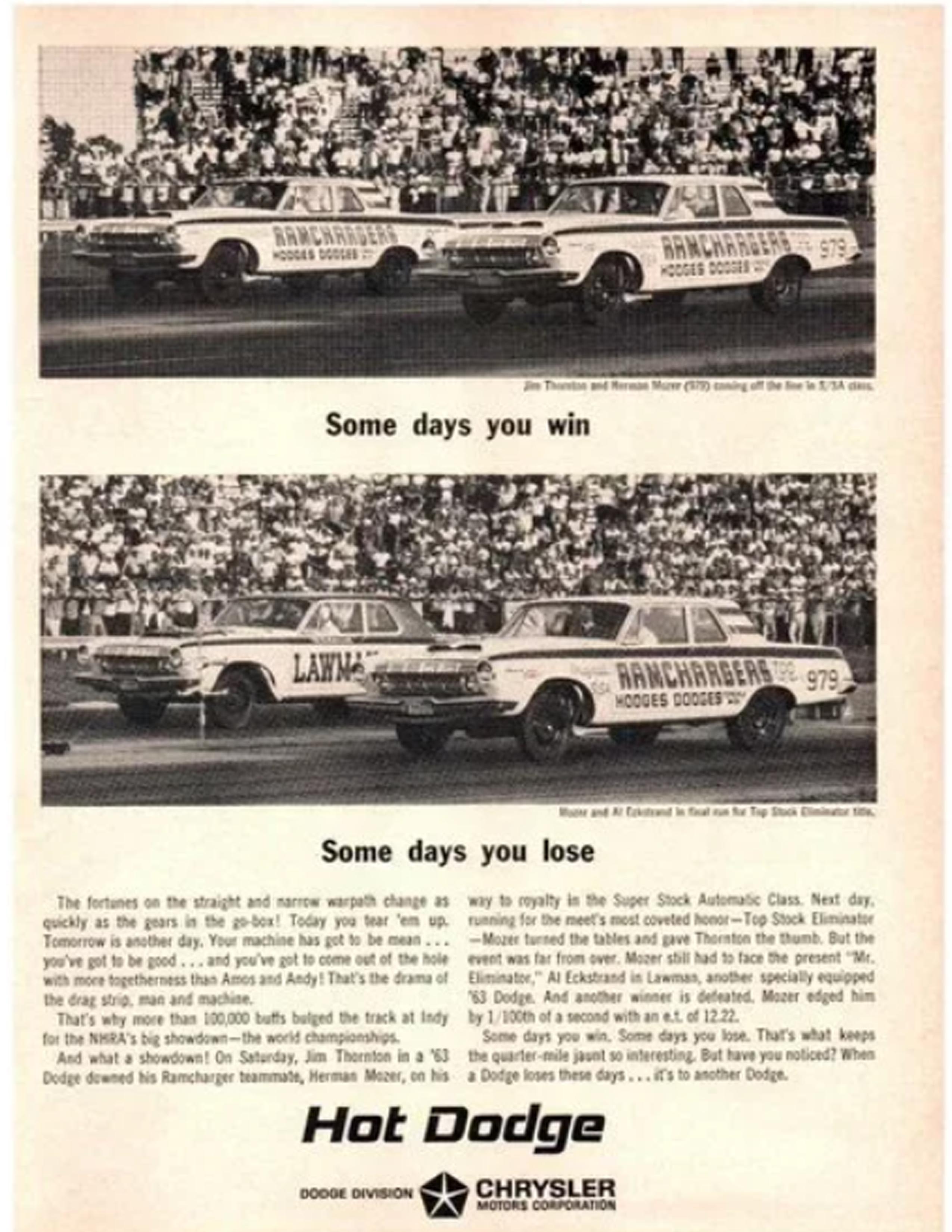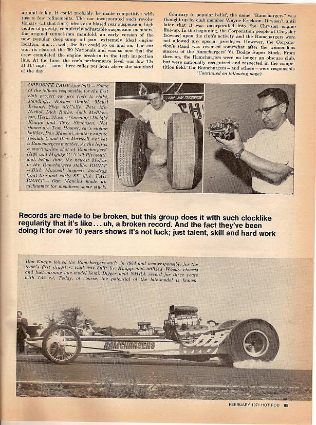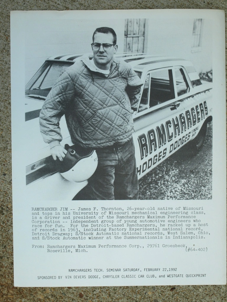 1971 was a bad year for The Ramchargers, and particularly for their top driver, Leroy Goldstein (aka The Israeli Rocket). They had two Challenger funny cars to start off that year, one suffered a catastrophic crash down in Texas, then they suffered an engine explosion which destroyed the entire car, and before the season was done, they crashed again at Michigan’s U.S. 131 Dragway, where the whole body flew off the car, hit the guardrail, and knocked its nose off and bent up a lot of tinwork. The front of the nose neatly broke off, and Kevin Masters, who was just a kid then, was right there where it happened with his dad. The nose landed nearby them, his dad grabbed it, and back then, nobody cared if you brought broken or burned up parts home with you. His dad put the nose of the Ramchargers funny car in their truck, they watched the rest of the races, then his dad hung it on their garage wall later that week, and it has been hanging there ever since, until just before the Pontiac, Michigan show! So, dirt and all, just as it was when it settled from the crash in 1971, the last remaining piece of a Ramchargers Challenger funny car was back for the world to see, like some kind of holy relic. That Challenger was rebuilt by the Ramchargers after the crash and sold to Arnie Beswick, but he crashed with it in 1972, the car burned, and that was the end of the first generation Ramchargers funny cars. So, this is the only piece of the 1970/1971 funny cars that still survives, and it exists just because Kevin Masters and his dad happened to be there that day when the big hunk of fiberglass flew across in front of them and landed in the grass! His father is gone now, but this is a remarkable family heirloom to Kevin, as he will never forget the day, they witnessed that crash, and how many of us can say they brought a piece of such a famous funny car home with their father.