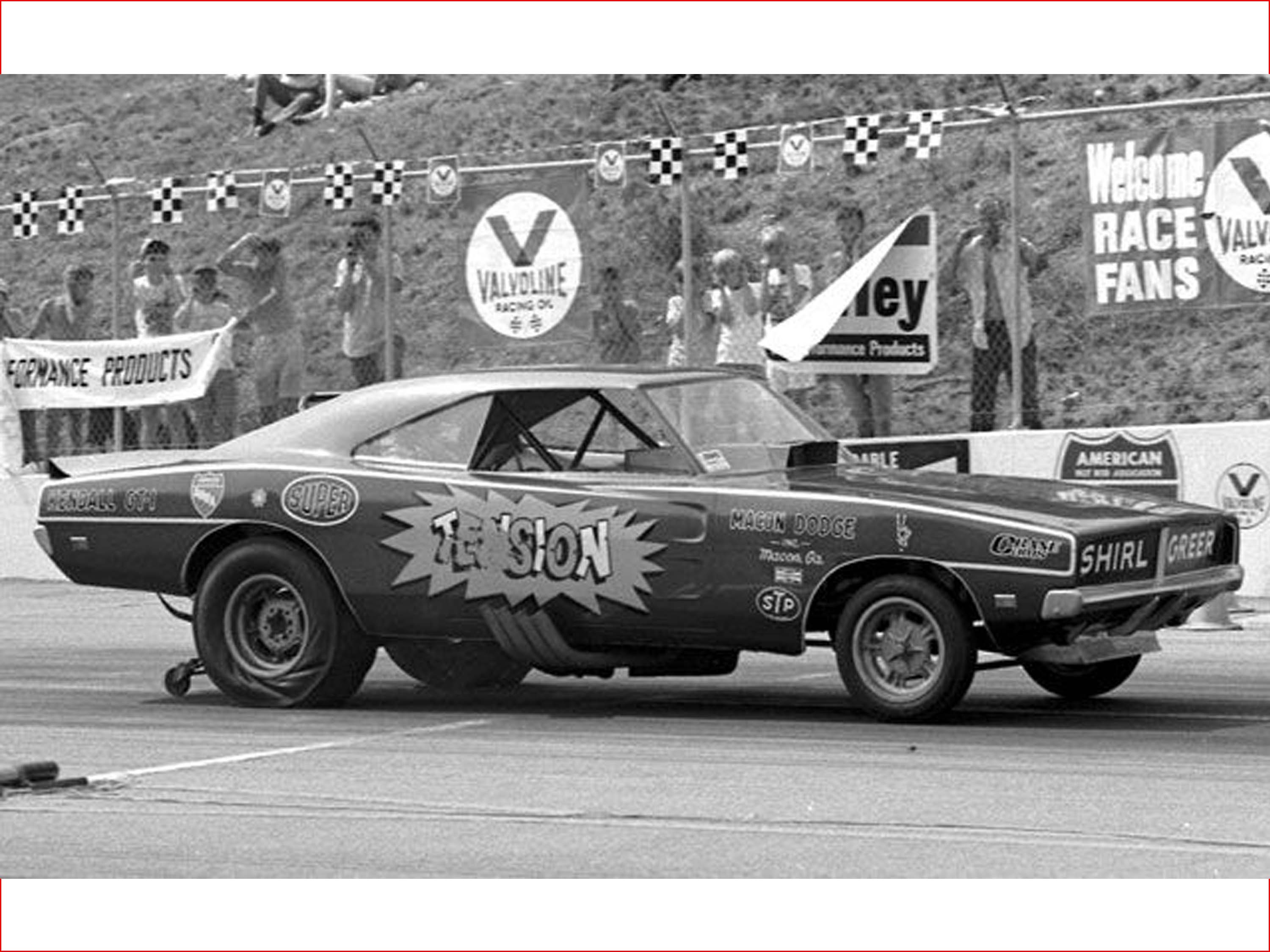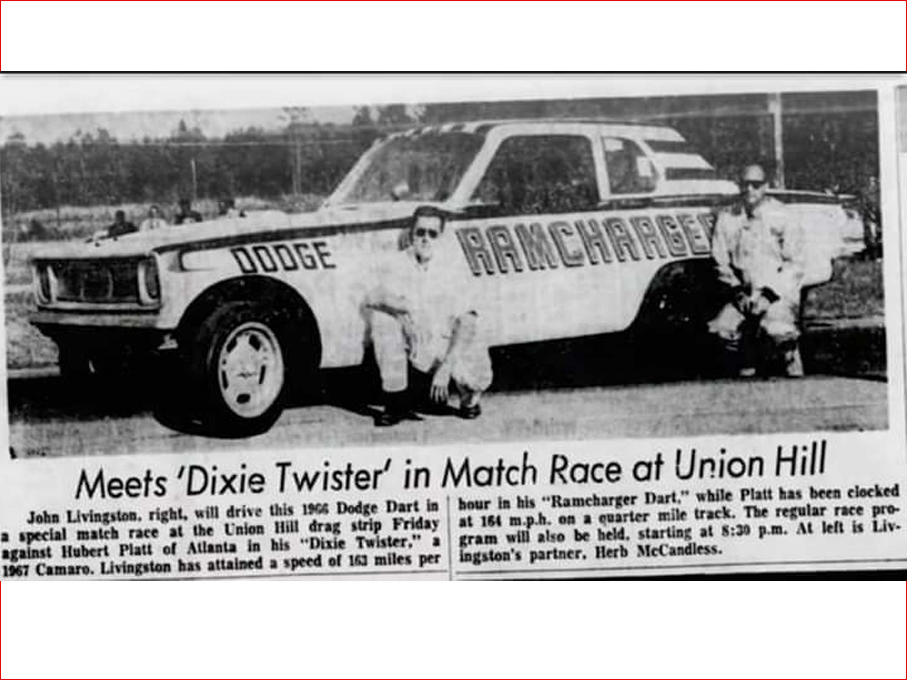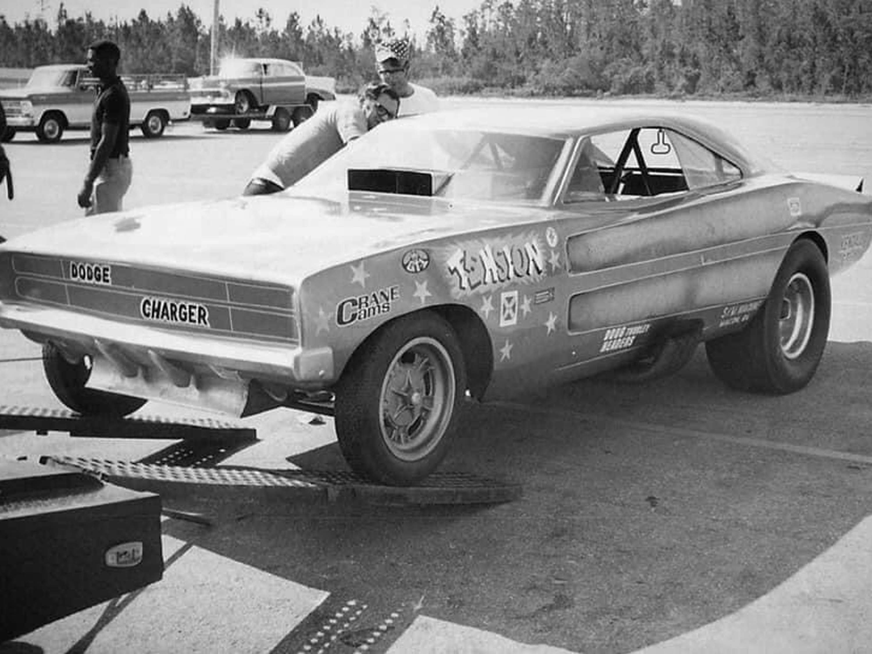 On Friday, May 12th, 1967, a Match Race was scheduled between the " RAMCHARGER Dart" and Huston Platt's "Dixie Twister" 1967 Camaro, at Union Hill Dragstrip in Tennessee. With John Livingston behind the wheel, the Dart would find itself in a horrible crash, ending up on its roof. John managed to survive the crash and continued to race for many years to come. But the Dart didn't fare so well. The body was destroyed. John and Herb sold the chassis to Sherl Greer who put a new 1969 Charger body on top of it for the 1969 and 1970 seasons. The New Charger body in metallic Blue sported the very well-known TENSION graphics on the sides, which Shirl Greer was well known for. When Greer was ready to move on to a new Funny Car for 1971, he sold the Charger to Gary Litton, who campaigned it as his Tennessee Shaker for a couple seasons. It changed hands at least two more times after that. From there, the Woody Gilmore chassis which was once a RAMCHARGERS Dodge Dart in a former life, slipped into obscurity.