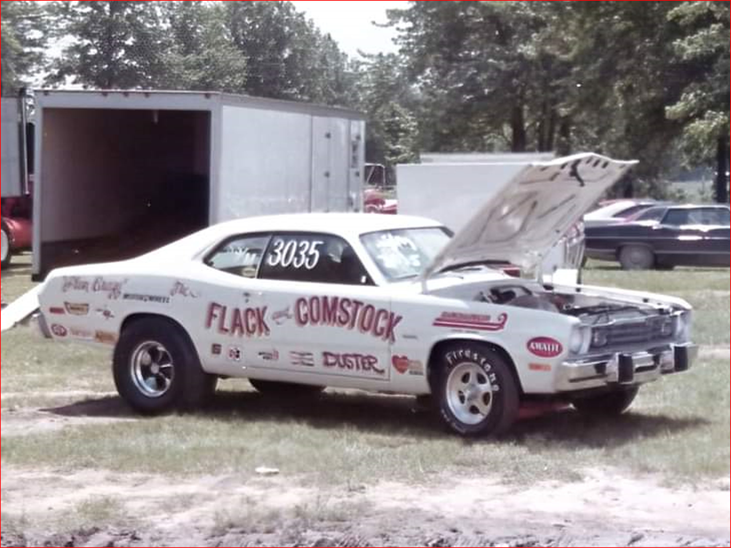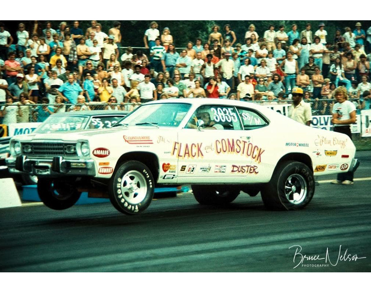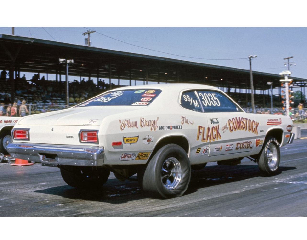 So, they sold the 64 Plymouth and ordered a White w/Black interior 74 Duster. Wanting the lightest possible car he could get, it was ordered with a Slant 6 engine and a 3-Speed manual, floor-shift transmission. Immediately upon receiving the brand-new Duster, they installed the 360 V8 Small Block that he and Comstock had assembled, along with an A-833 4-Speed trans and a Dana 60 rear end. Flack & Comstock were emblazoned across the sides of the car and his "Plum Crazy" name was added to the quarter panels. Like a rocket shot out of a cannon, the Flack & Comstock Duster set out in NHRA in 1974, winning their class at its first race in Gainesville. Winning numerous events and races, the Duster was the car to beat at any track it showed up at.