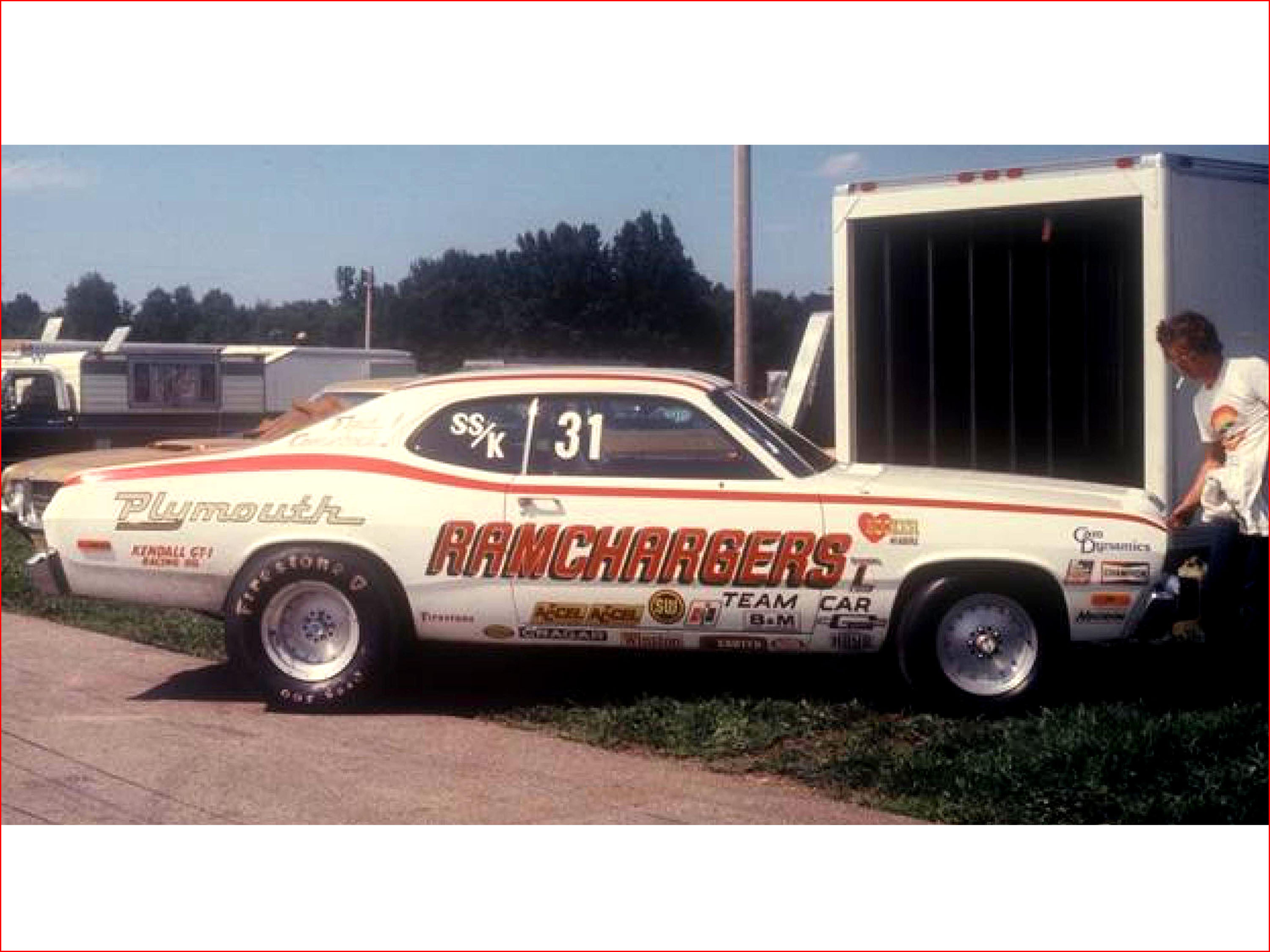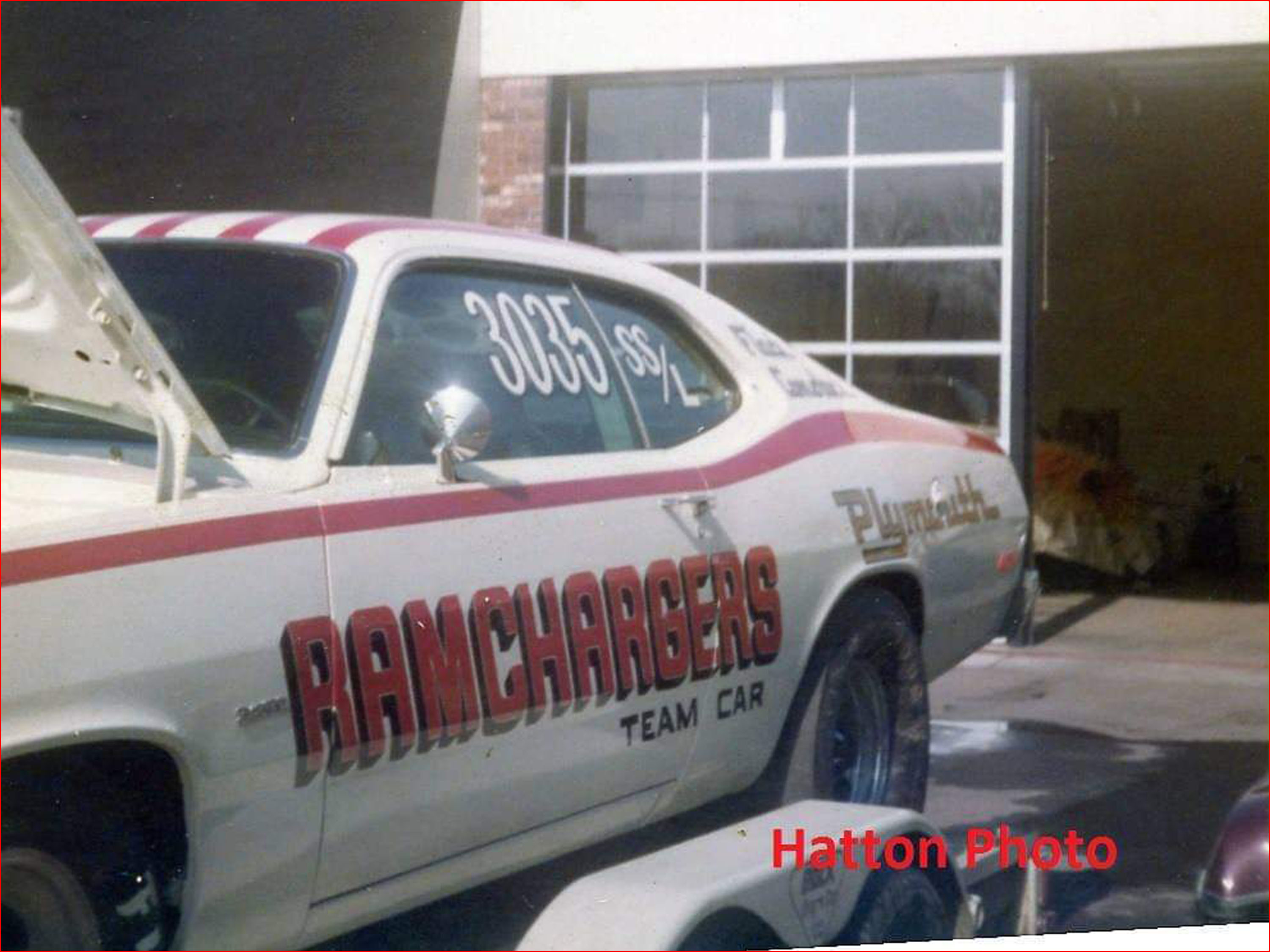 The Duster, along with the two Cudas, were sent to Paul Hatton, of Hatton's House of Krazy Paint, to have the traditional 7 Candy Stripes and RAMCHARGERS name applied. Different from the 60's, however, the cars also had TEAM CAR lettered under the logos on the sides of the car. This was because, for the first time, the RAMCHARGERS did not own the cars. These were officially sponsored cars, and the entry for the RAMCHARGERS at the events where they competed. But still not exactly the same procedure as they had done in the past.