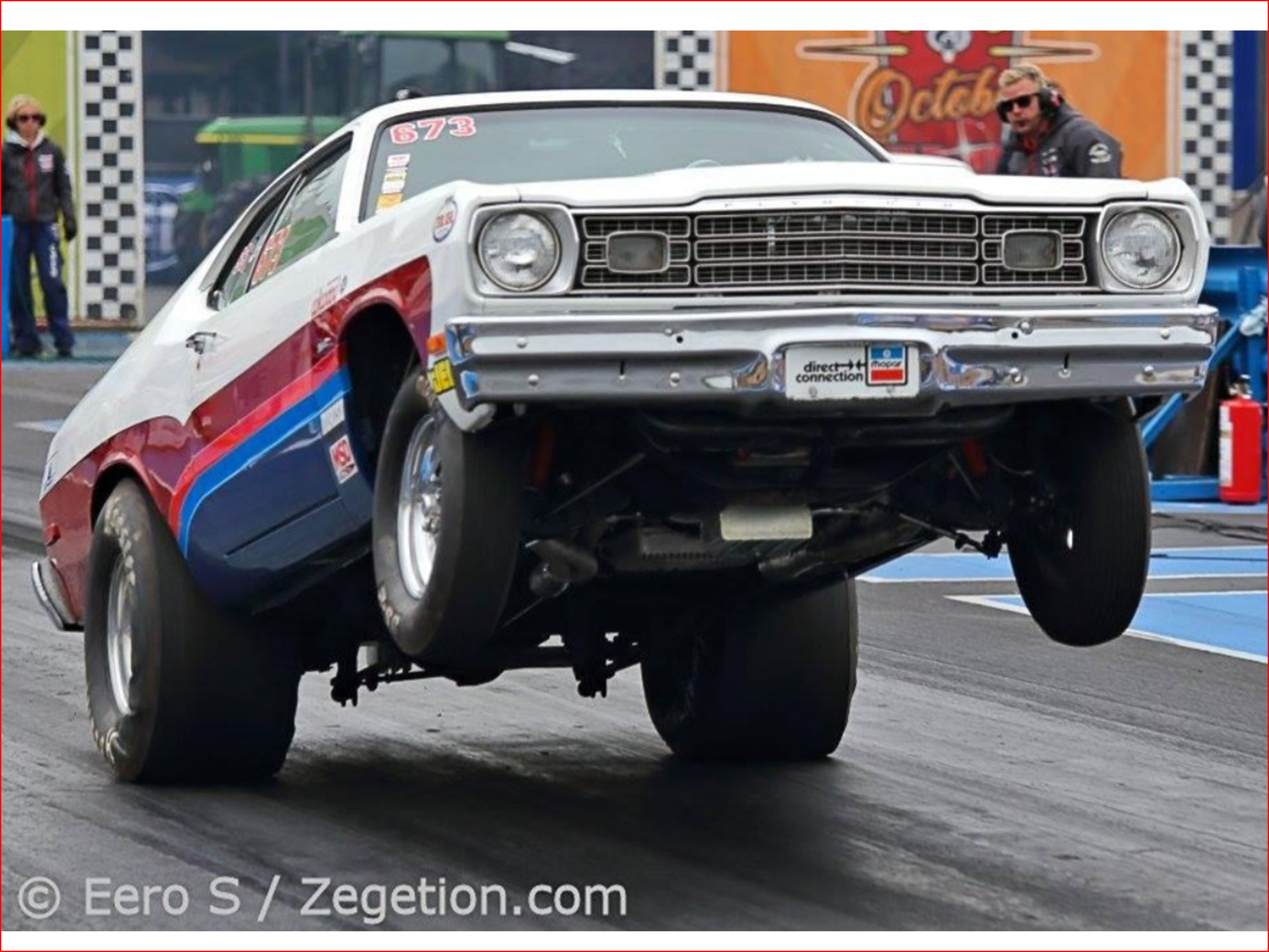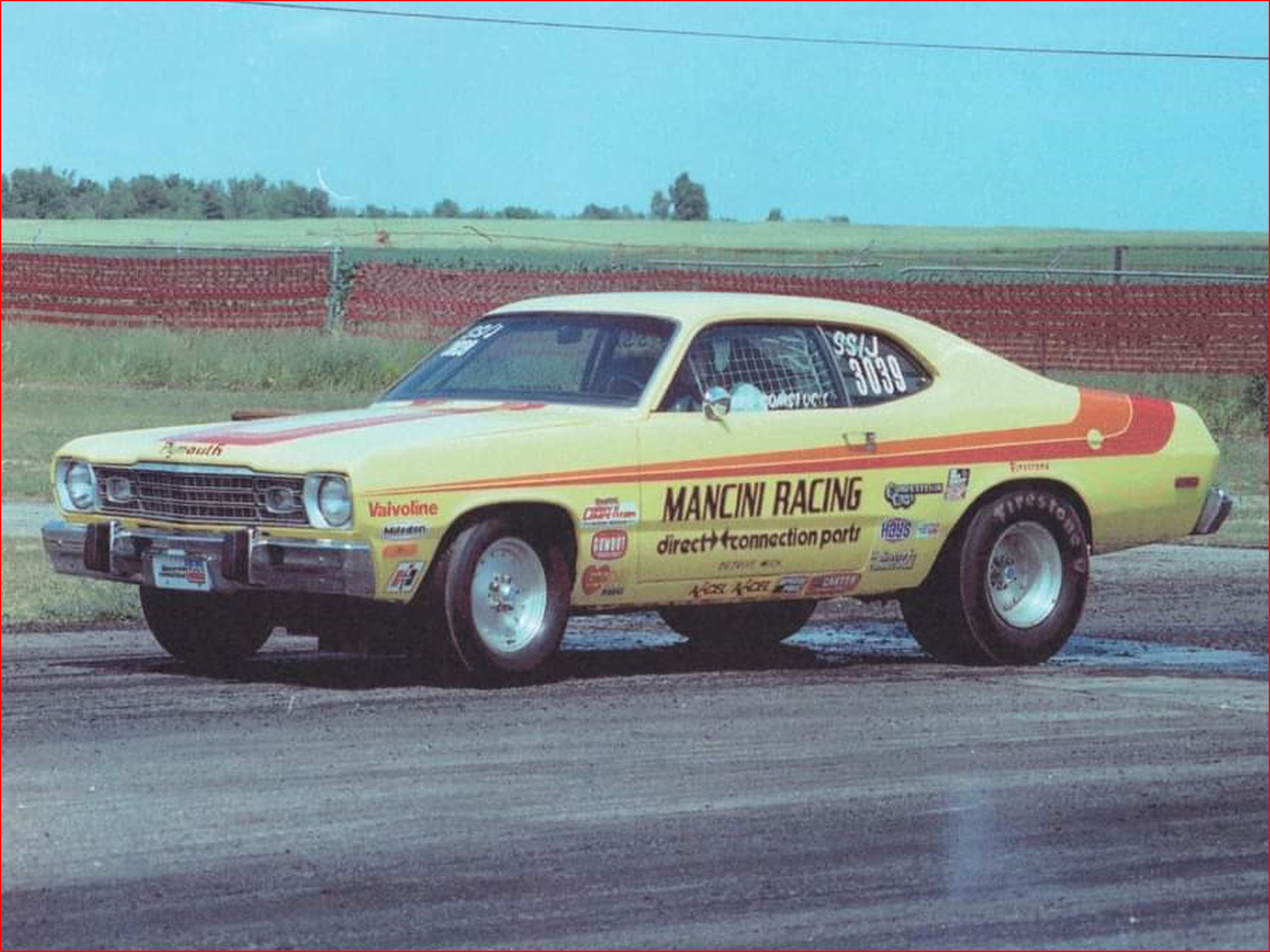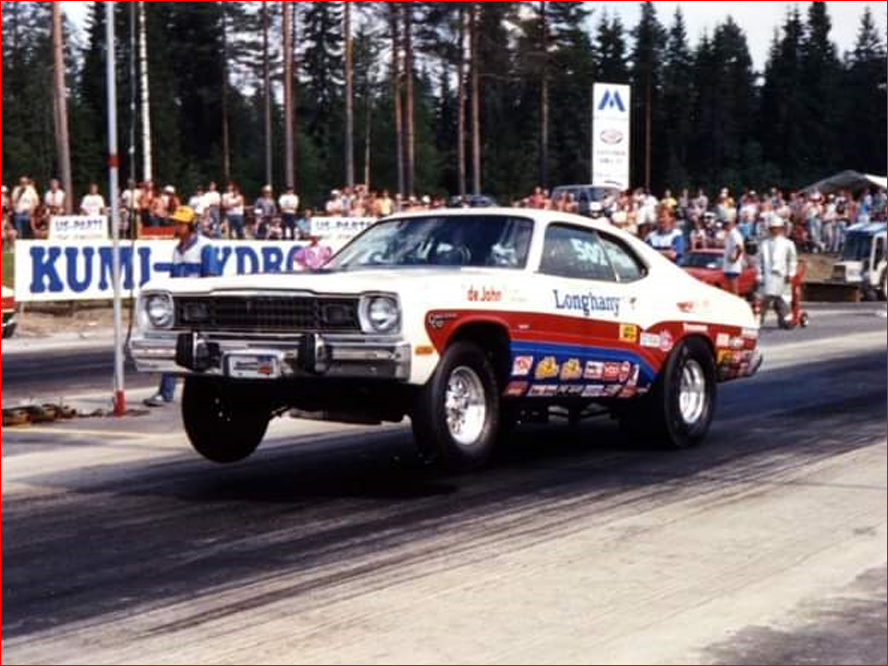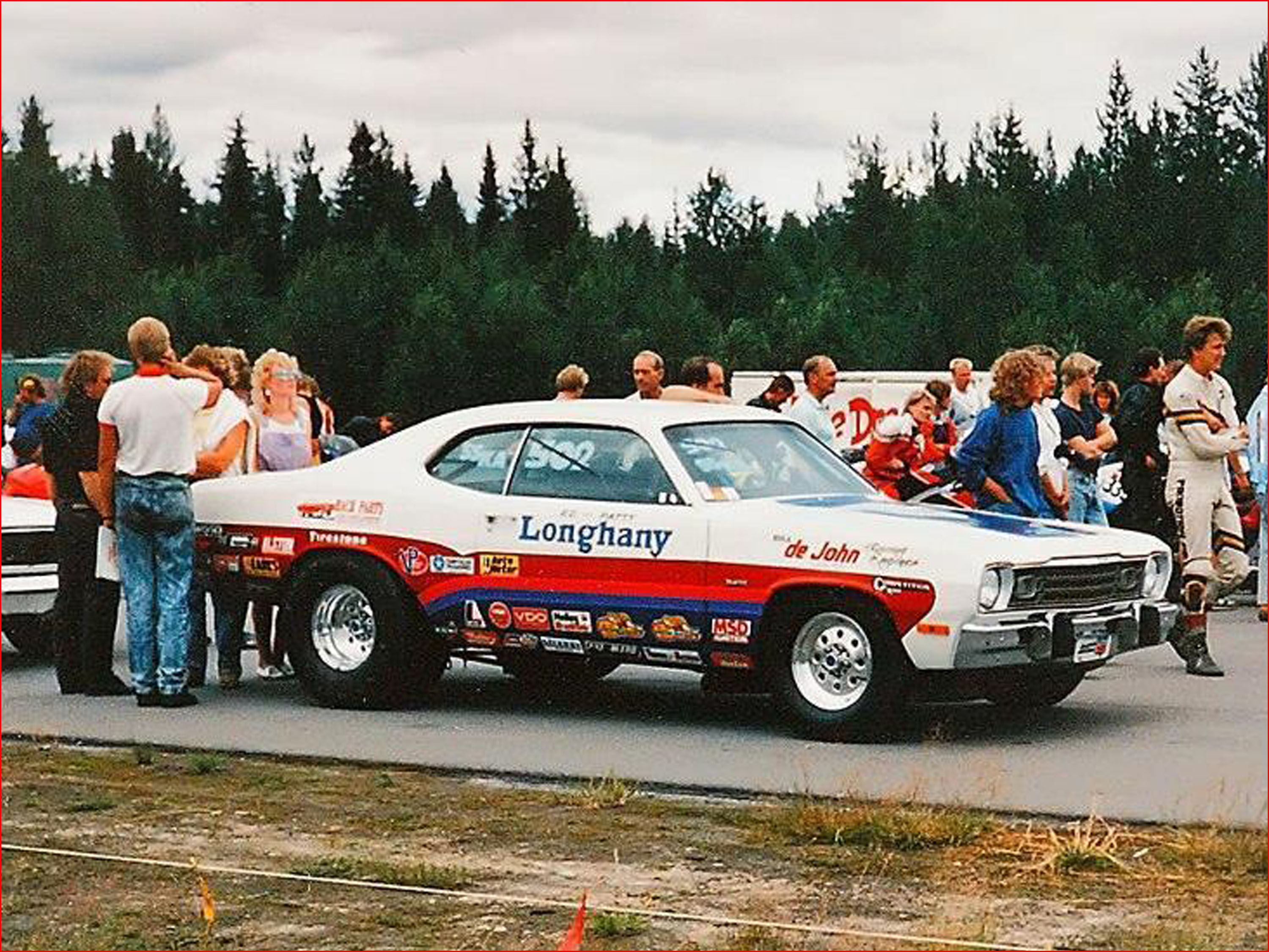 Now wearing the Yellow and Orange colors of Mancini Racing, the Duster continued to dominate its class in Super Stock for the next few years. After Ted quit racing in 1978 Howard bought the car from Cunnigham and Franks and campaigned it for a short time. It was sold to Ed Longhany of North Carolina in 1980. Ed painted it White again, with Red and Blue stripes. He raced it until 1989, when it was sold to Jan Holm of Sweden. Holm took the car across the Atlantic and raced it there until 1994, in SS/KA. Still wearing its Longhany paint scheme, but no longer having the Longhany lettering on the doors. And now, running with an automatic transmission behind the 360. In 1995, it was sold again and taken to Finland, where it still races today.